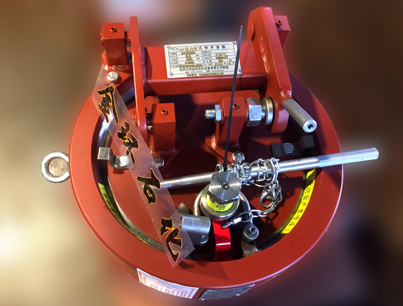 快開(kāi)盲板是用于壓力管道或壓力容器的圓形開(kāi)口上的一種機(jī)械裝置。一般由筒體法蘭、頭蓋、勾圈或卡箍、密封圈、安全聯(lián)鎖機(jī)構(gòu)、開(kāi)閉機(jī)構(gòu)、轉(zhuǎn)臂及短節(jié)(需要時(shí))等部件構(gòu)成。
