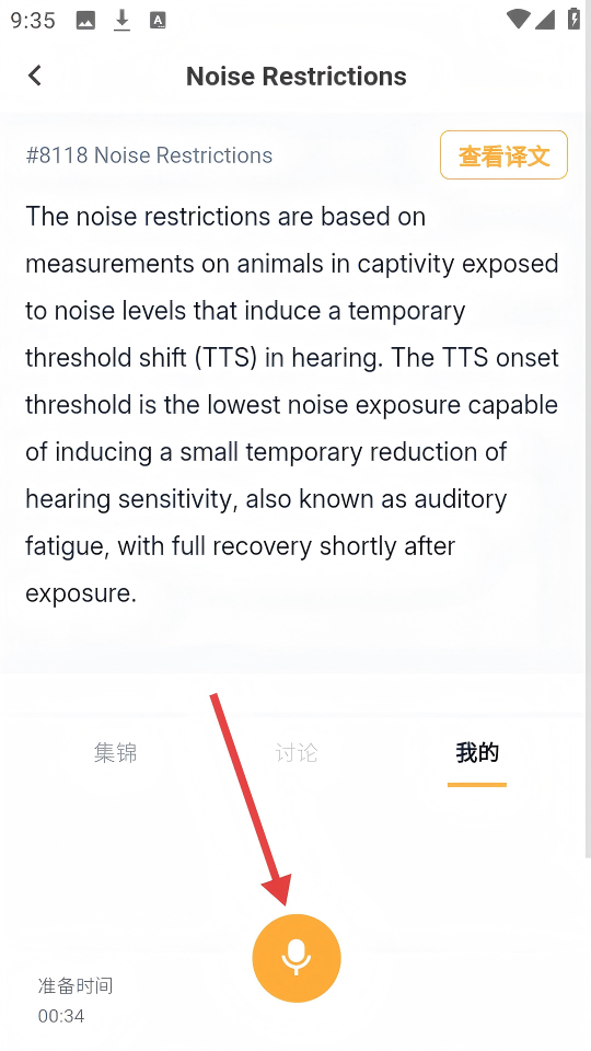 4、在【NoiseRestrictions】題目頁(yè)面,點(diǎn)擊底部麥克風(fēng)按鈕進(jìn)行朗讀練習(xí)。