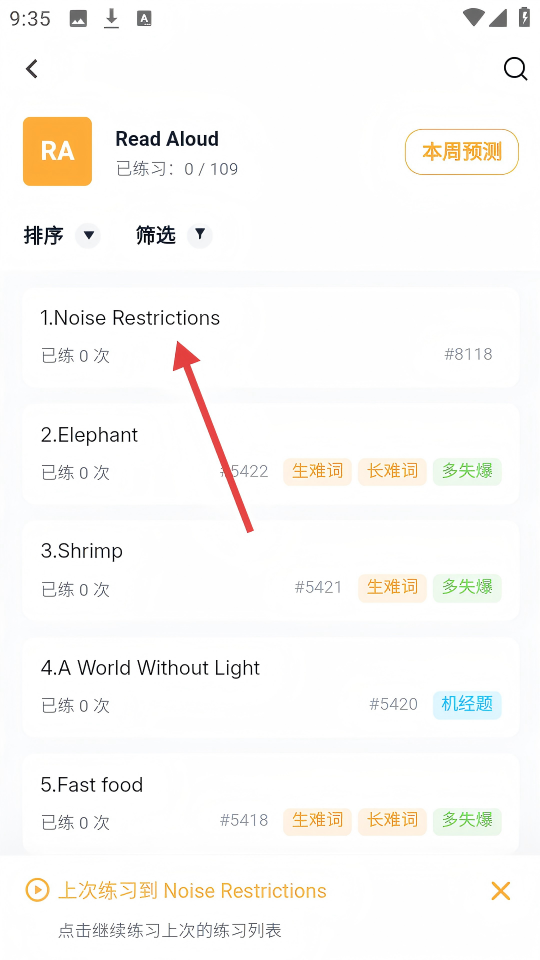 3、在ReadAloud練習(xí)界面,選擇【NoiseRestrictions】題目,進(jìn)行朗讀備考。