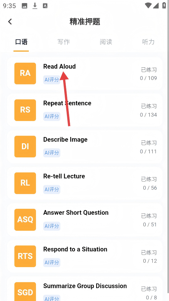 2、進(jìn)入精準(zhǔn)押題頁(yè)面,在口語(yǔ)分類下,選擇【ReadAloud】題型,開展朗讀訓(xùn)練。