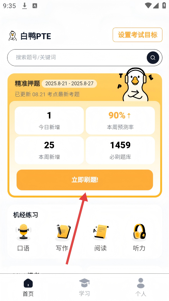1、打開應(yīng)用,進(jìn)入精準(zhǔn)押題板塊,點(diǎn)擊【立即刷題】按鈕,練習(xí)近期更新考題。