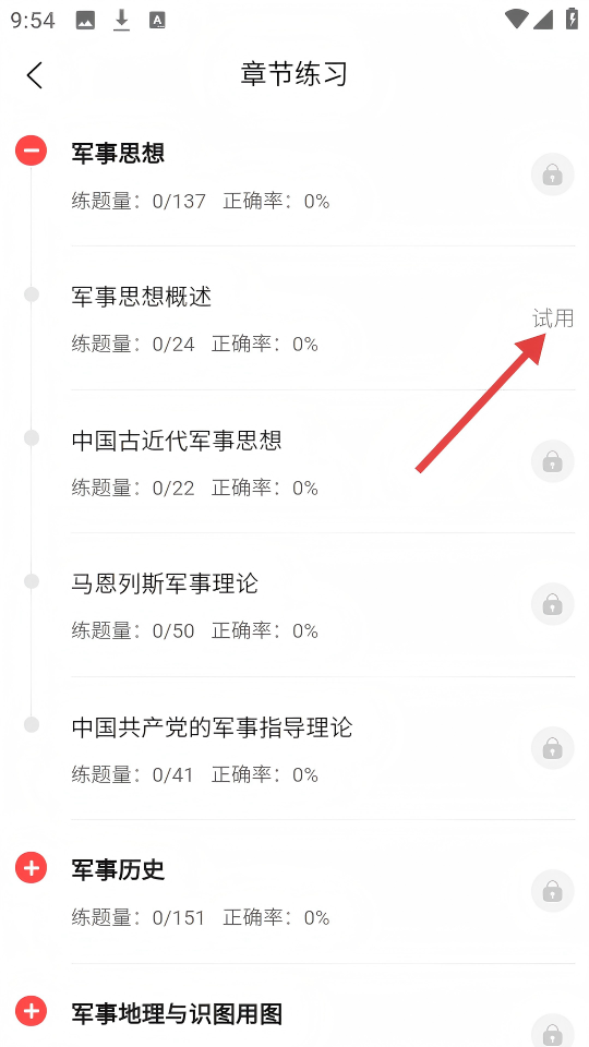 3、展開軍事思想章節(jié)后,點擊【軍事思想概述】右側的【試用】,進入該小節(jié)練習。