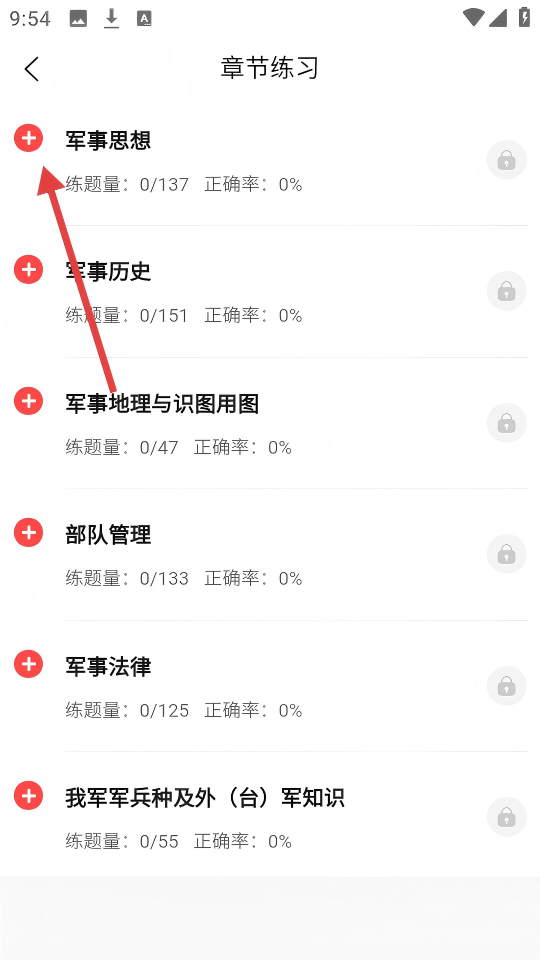 2、在章節(jié)練習頁面,點擊【軍事思想】左側的紅色加號,展開該章節(jié)的練習內(nèi)容。