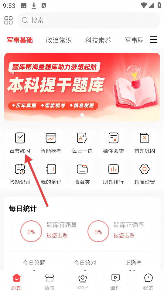 1、進入本科提干題庫的軍事基礎板塊,點擊【章節(jié)練習】選項開始章節(jié)訓練。