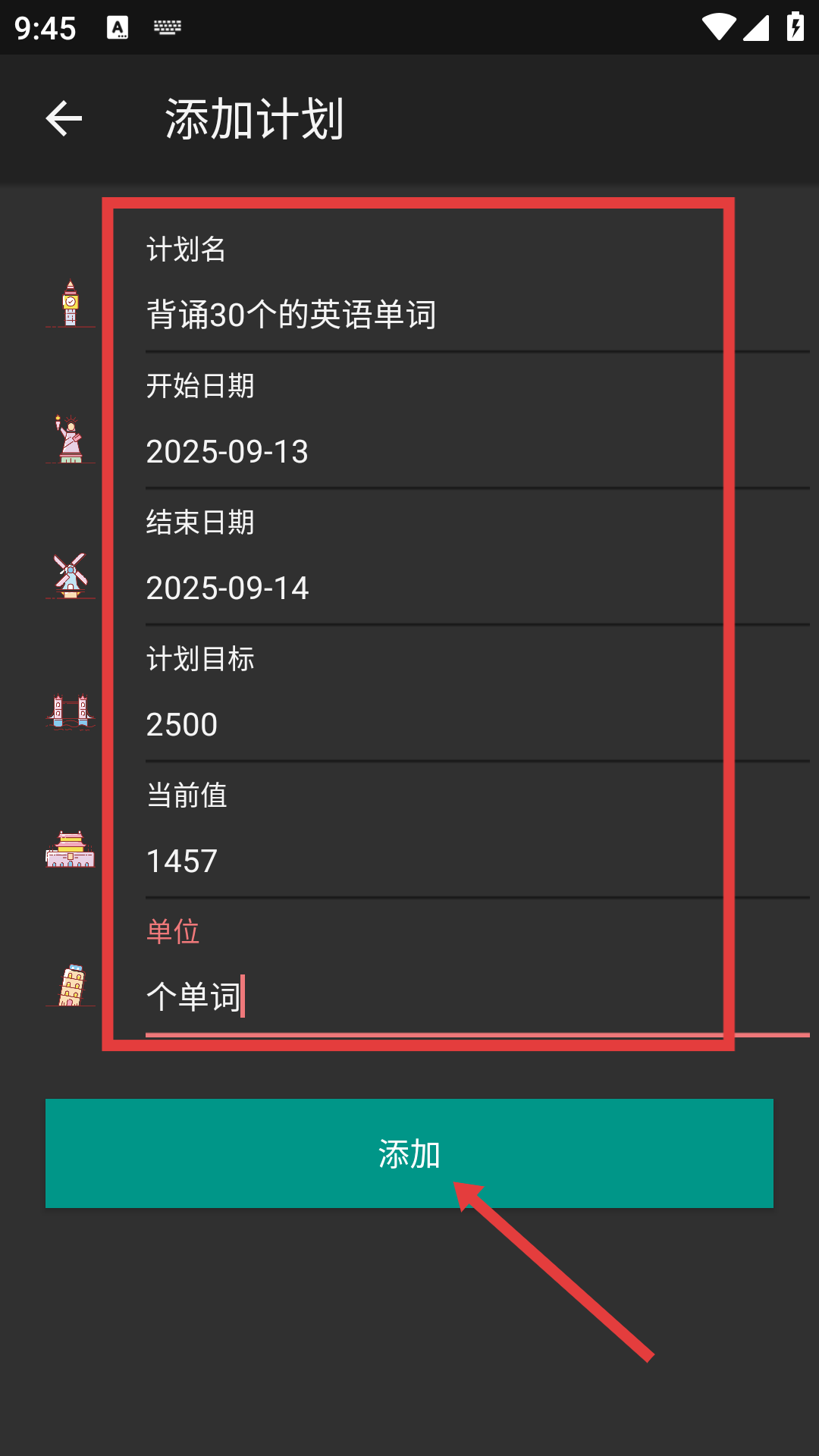 3、在定量計(jì)劃設(shè)置頁(yè),填寫(xiě)【計(jì)劃名-背誦30個(gè)的英語(yǔ)單詞】【開(kāi)始日期-2025-09-13】等信息后,點(diǎn)擊“添加”按鈕完成計(jì)劃創(chuàng)建。