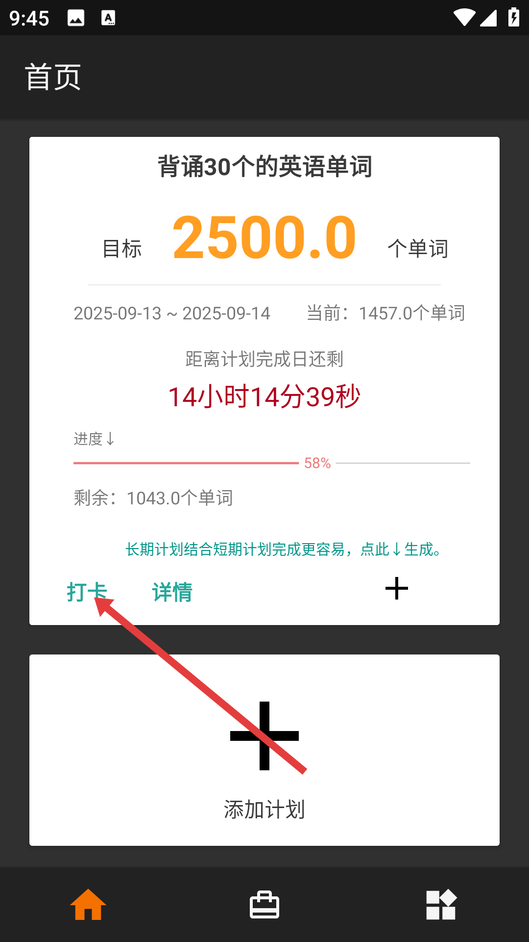 4、返回首頁(yè),找到已添加的“背誦30個(gè)的英語(yǔ)單詞”計(jì)劃卡片,點(diǎn)擊【打卡】按鈕記錄計(jì)劃進(jìn)度。