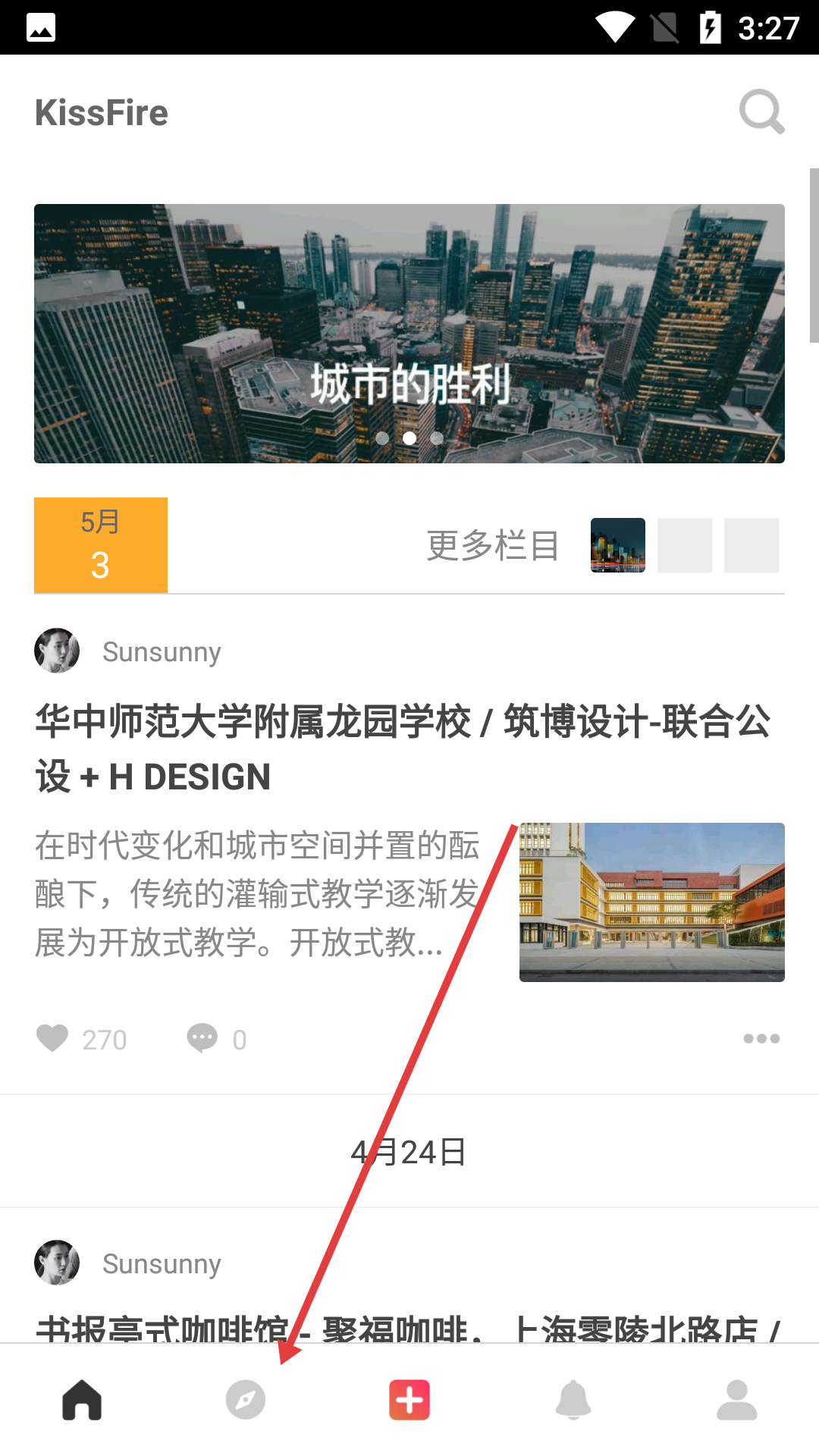 1、打開(kāi)KissFire軟件,在首頁(yè)點(diǎn)擊底部導(dǎo)航欄中【發(fā)現(xiàn)】圖標(biāo)(鉛筆形狀)。