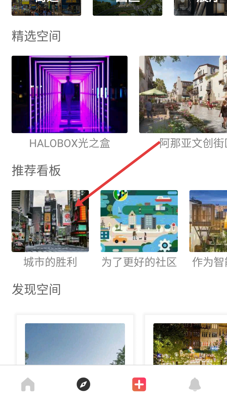 2、在【發(fā)現(xiàn)】頁(yè)面的【推薦看板】中,點(diǎn)擊【城市的勝利】選項(xiàng)。