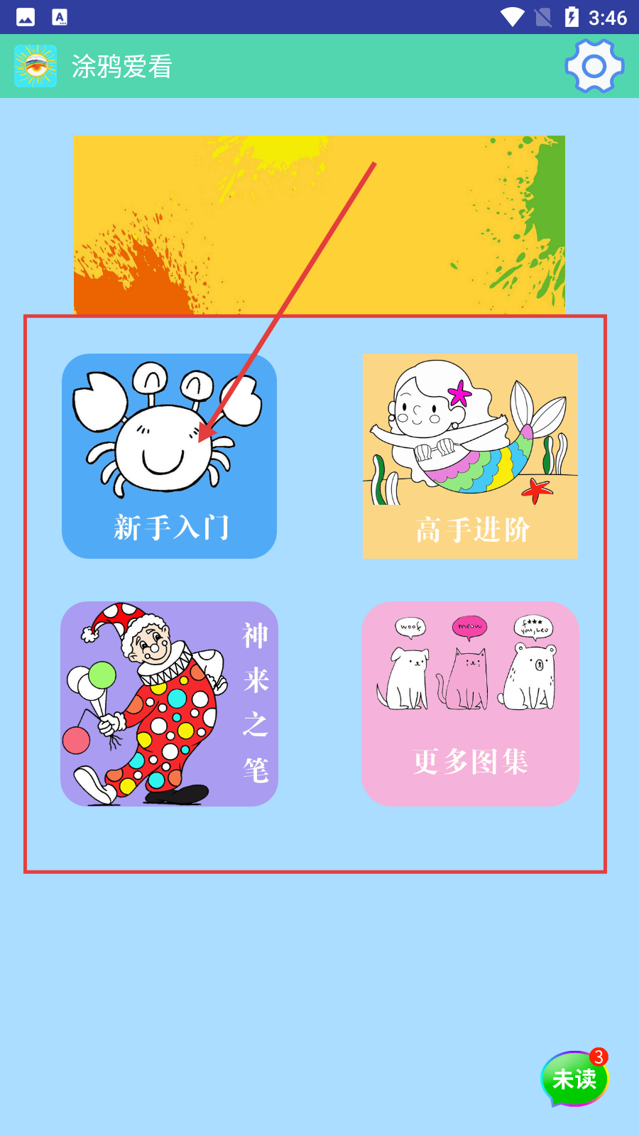 2、進入【涂鴉愛看】主界面后,可選擇【新手入門】【高手進階】【神來之筆】【更多圖集】等模塊開始涂鴉。