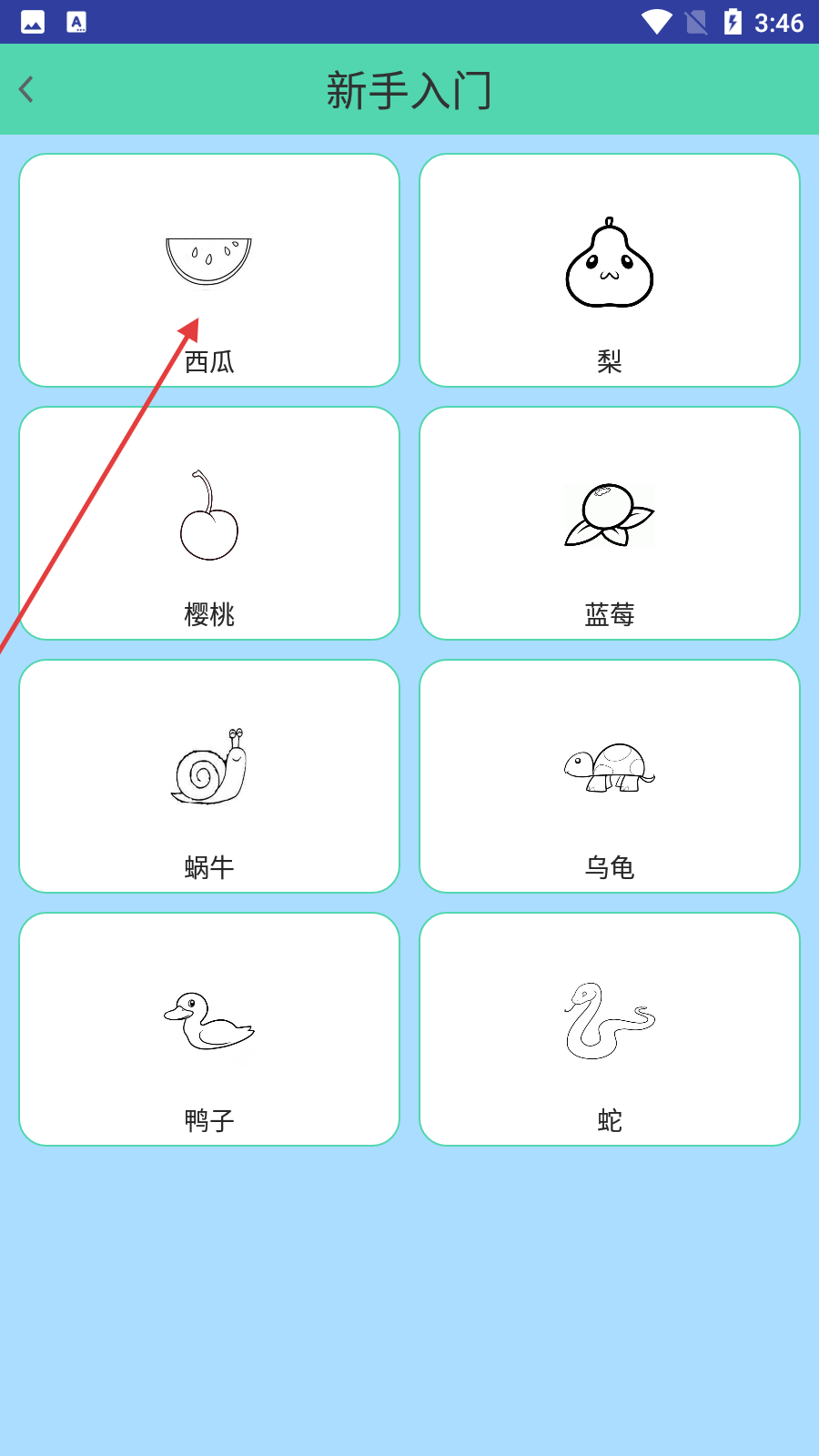 3、進入【新手入門】模塊后,選擇想要涂鴉的圖案,比如【西瓜】,點擊進入涂鴉頁面。