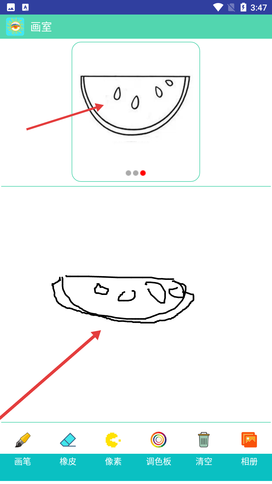 4、在【畫室】界面,參照上方的西瓜圖案,使用底部的【畫筆】【橡皮】等工具進行涂鴉創(chuàng)作。