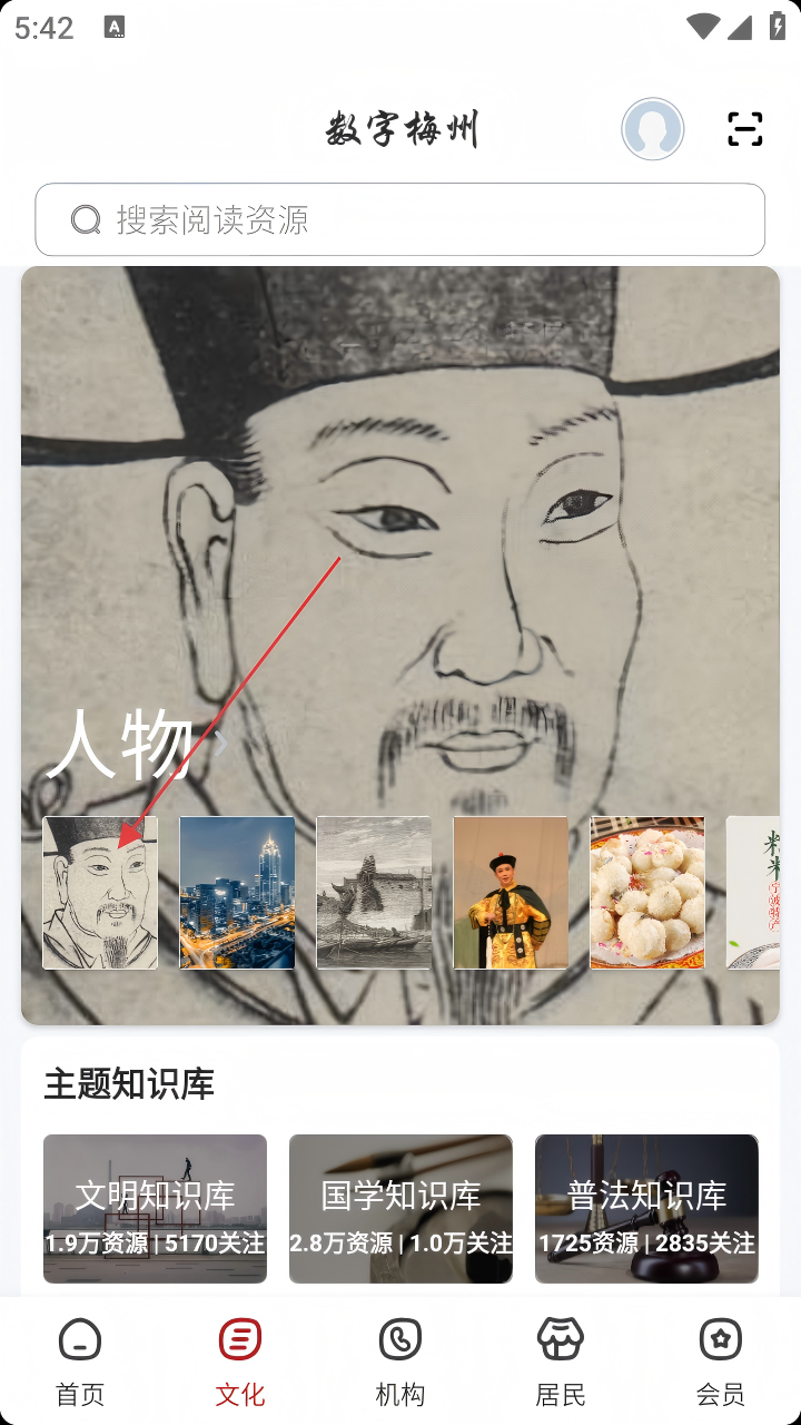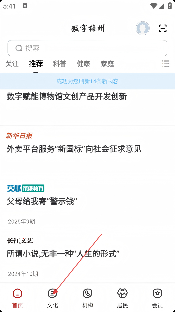 1、打開“數(shù)字梅州”APP,進(jìn)入首頁后,點擊底部導(dǎo)航欄的【文化】選項,進(jìn)入文化頁面。