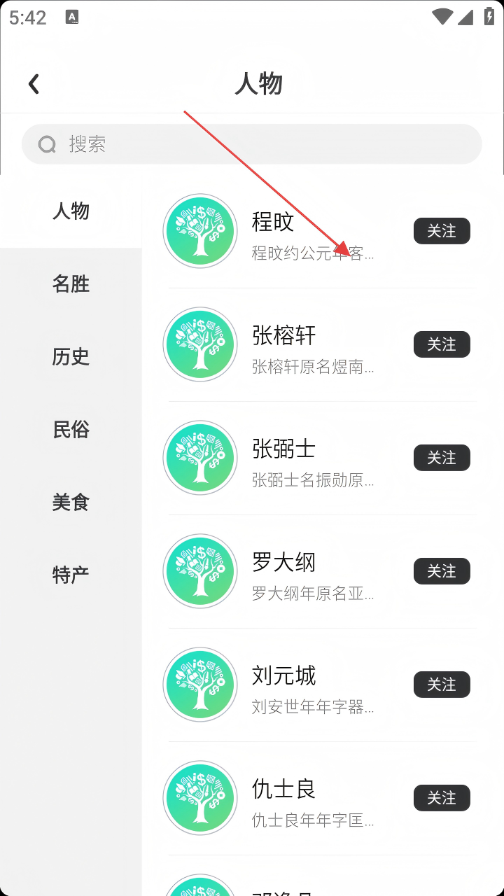 3、在人物列表頁面,找到【程旼】并點擊,進(jìn)入程旼人物信息頁面。