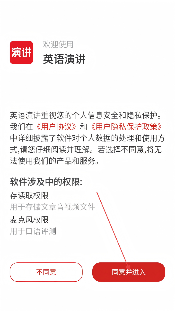 1. 打開英語演講,在彈出的隱私協(xié)議頁面,點擊【同意并進(jìn)入】,進(jìn)入APP。