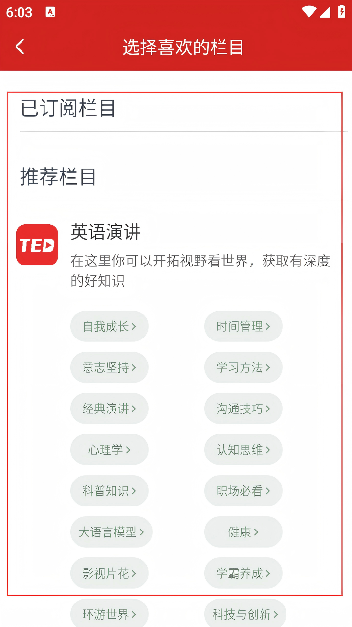 2. 進(jìn)入后,在“選擇喜歡的欄目”頁面,可查看【已訂閱欄目】和【推薦欄目】,選擇感興趣的欄目。