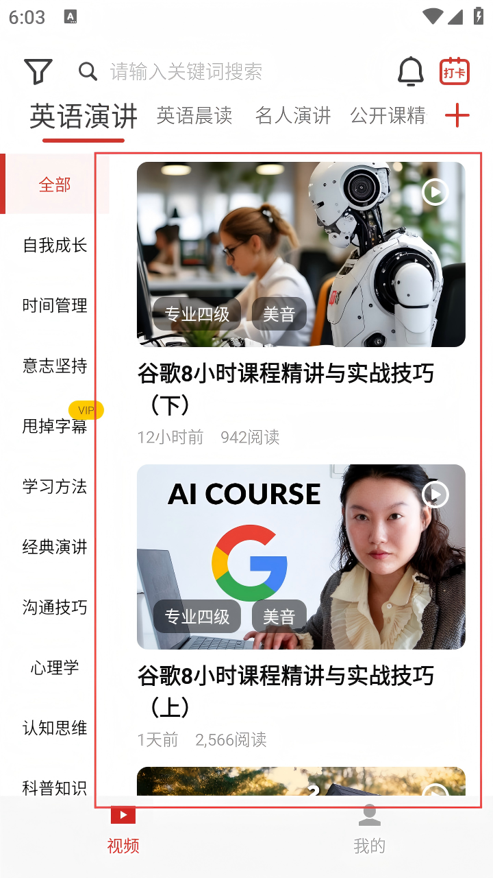 3. 選擇欄目后,進(jìn)入內(nèi)容展示頁面,可看到如“谷歌8小時課程精講與實戰(zhàn)技巧”等英語演講相關(guān)內(nèi)容。