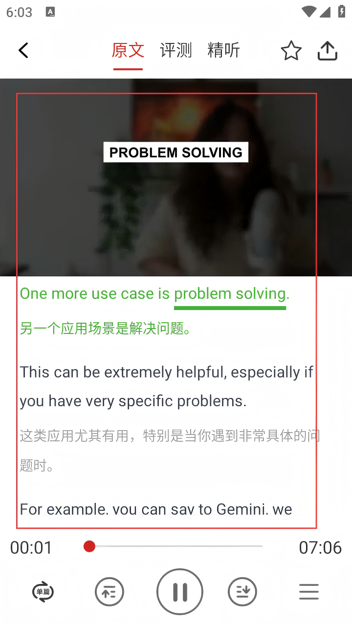 4. 點擊感興趣的內(nèi)容,進(jìn)入詳情頁面,可查看英文原文及中文翻譯,還能進(jìn)行評測、精聽等操作。