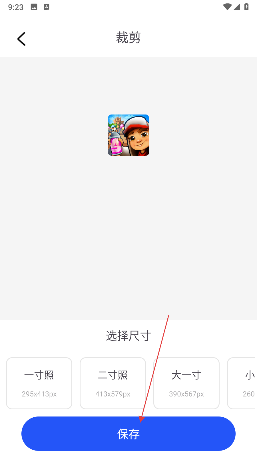 4、進(jìn)入裁剪頁(yè)面后,可選擇尺寸,接著點(diǎn)擊【保存】,即可完成照片裁剪保存。