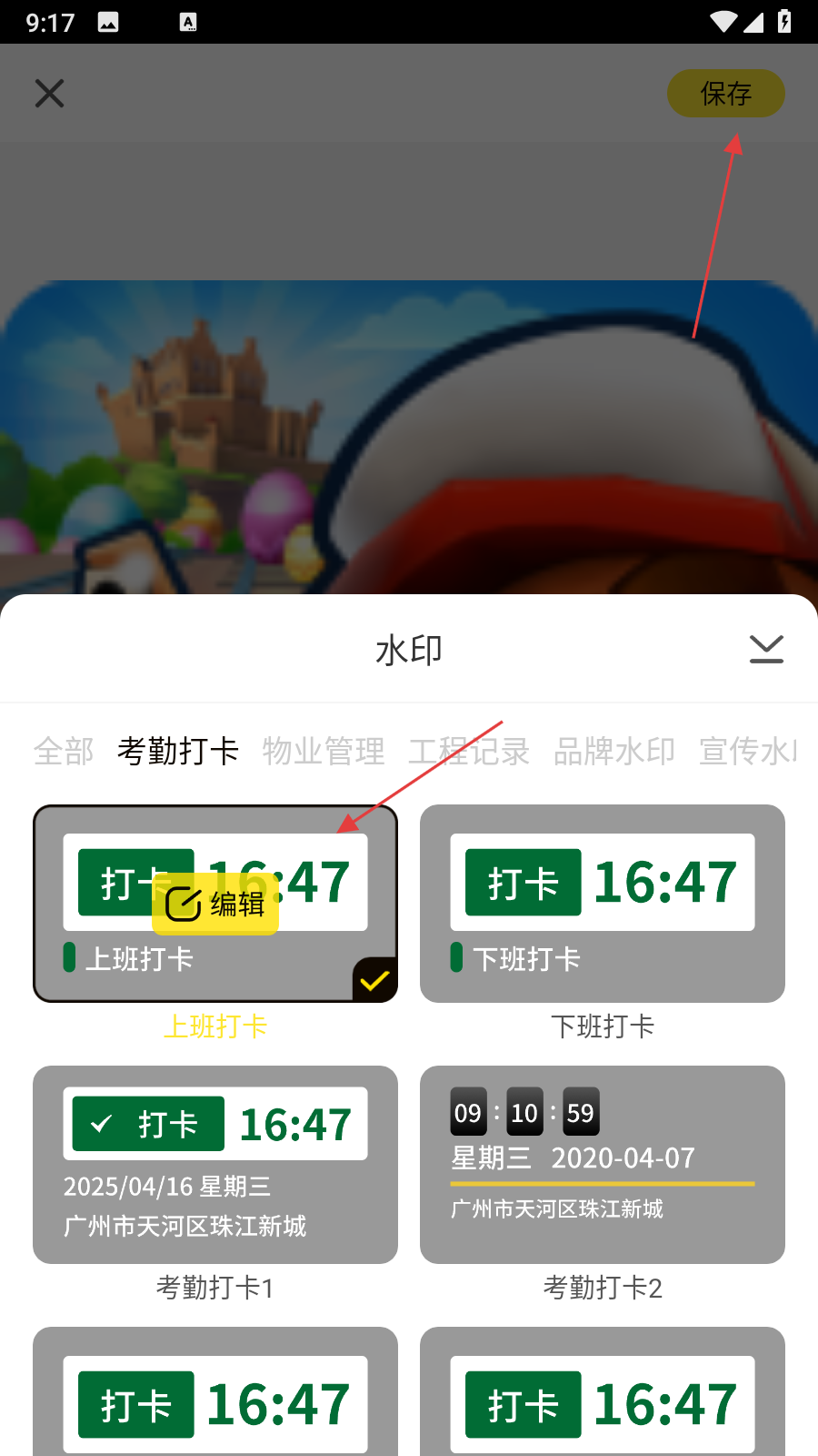 4、在水印選擇界面【選好水印后】,點(diǎn)擊右上角【保存】,即可完成帶水印圖片的保存。