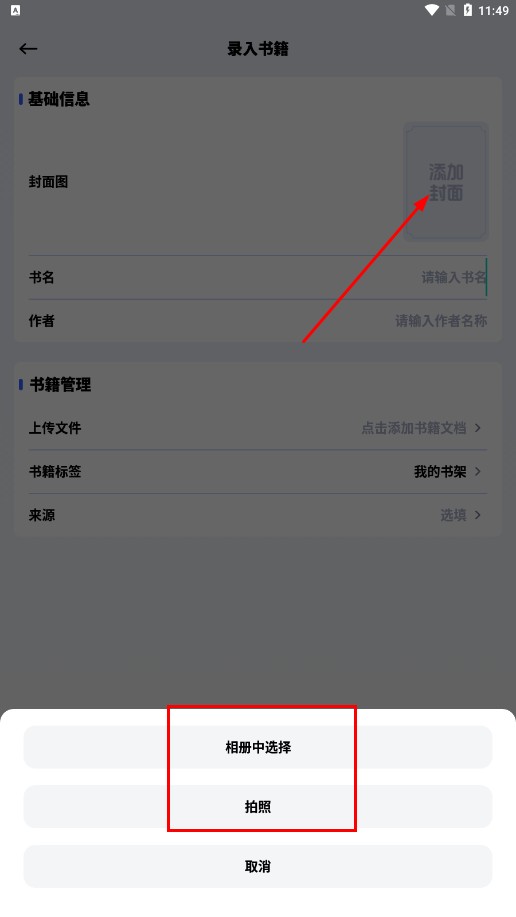 2、在錄入書籍頁面,點擊【添加封面-按鈕】,可選擇從相冊選圖或拍照來添加封面。