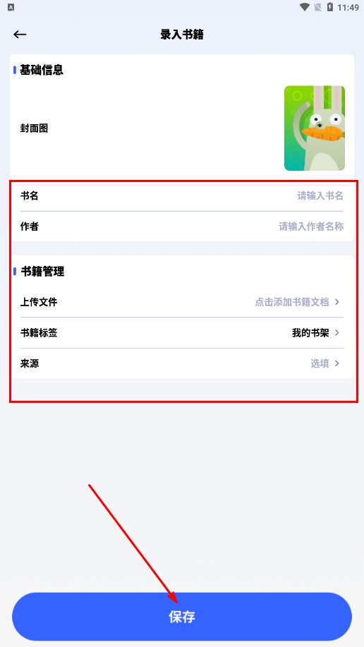 4、在錄入書籍頁面,填寫書名、作者等信息,設(shè)置書籍管理相關(guān)內(nèi)容后,點擊【保存-按鈕】,完成書籍錄入。