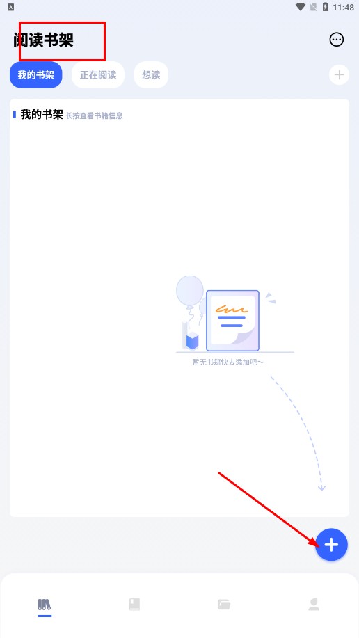 1、在“閱讀書架”頁面,點擊右下角【+號按鈕】,進入錄入書籍頁面。