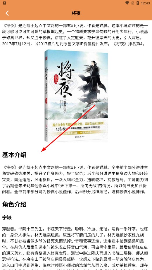 4、在《將夜》詳情頁(yè),可查看書(shū)籍的基本介紹、角色介紹等內(nèi)容。