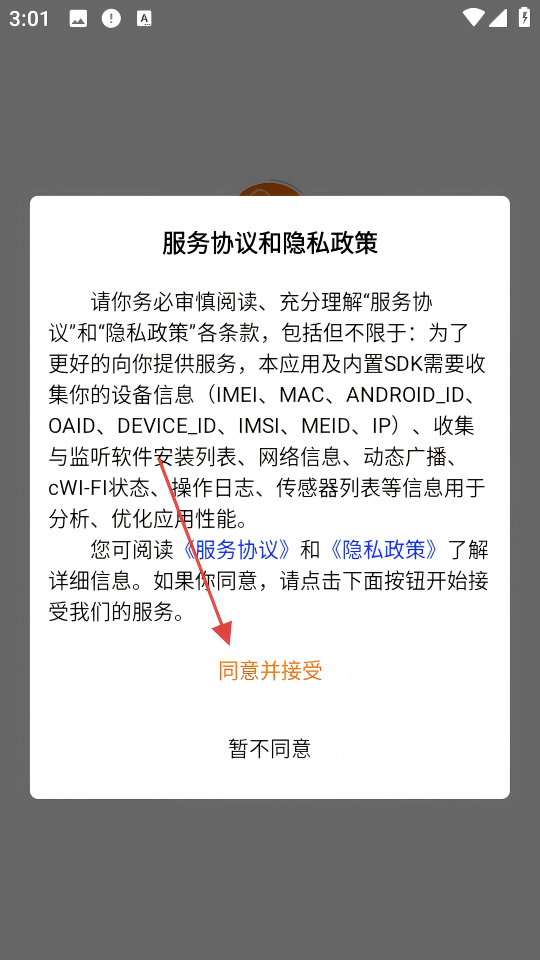 1、點擊“服務(wù)協(xié)議和隱私政策”彈窗中的“同意并接受”,進(jìn)入應(yīng)用。