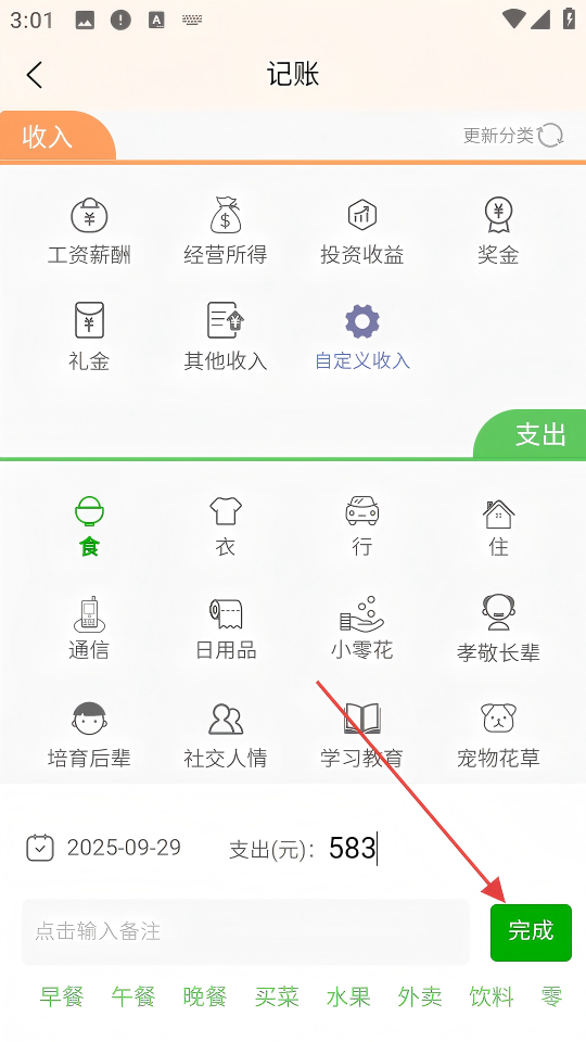 3、在記賬頁選擇收支類型、分類,填寫金額后,點擊【完成】。
