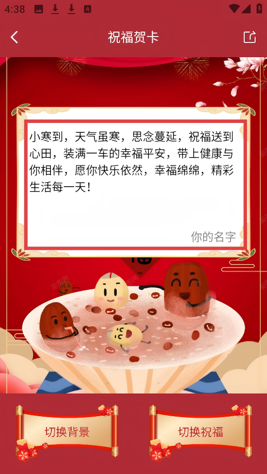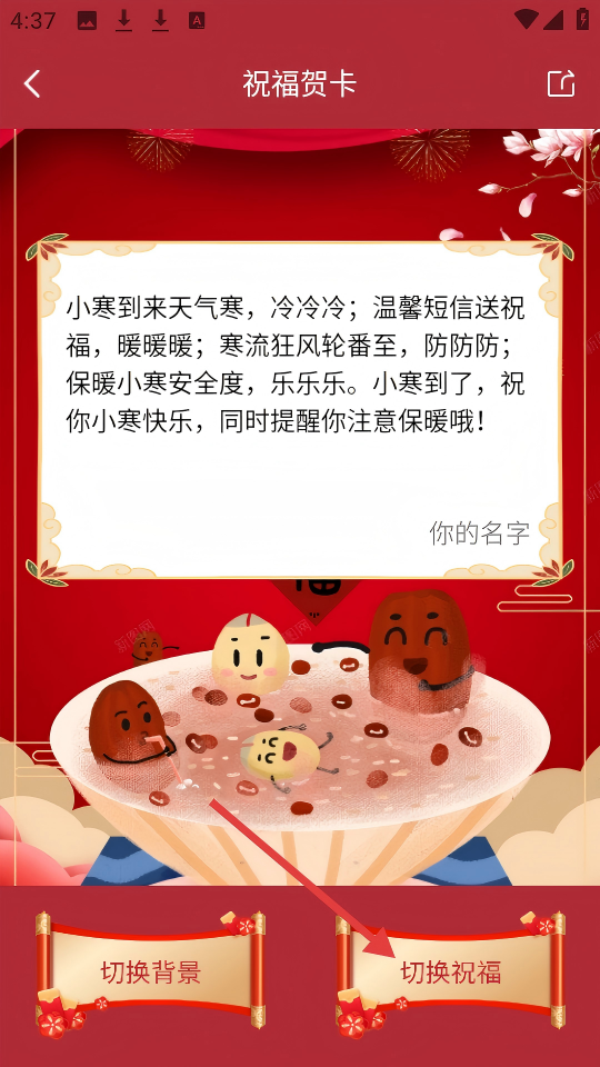 2、在小寒祝福賀卡頁面,點擊【切換祝?!堪粹o,查看更多小寒祝福內(nèi)容。