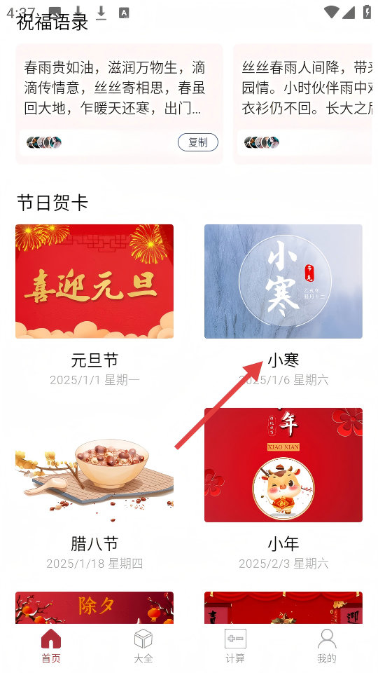 1、在節(jié)日賀卡區(qū)域,點擊【小寒】賀卡,進(jìn)入祝福賀卡頁面。