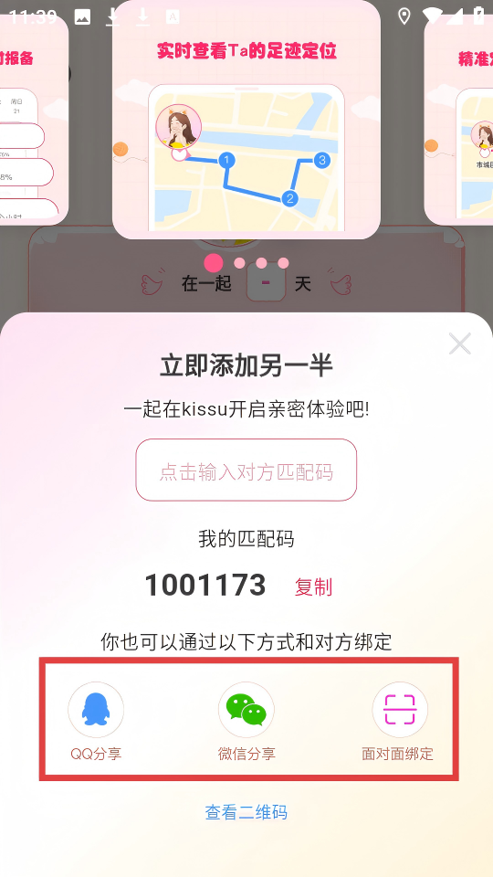 4、可通過輸入對方匹配碼,或使用【QQ分享】【微信分享】【面對面綁定】等方式,添加另一半開啟親密體驗。