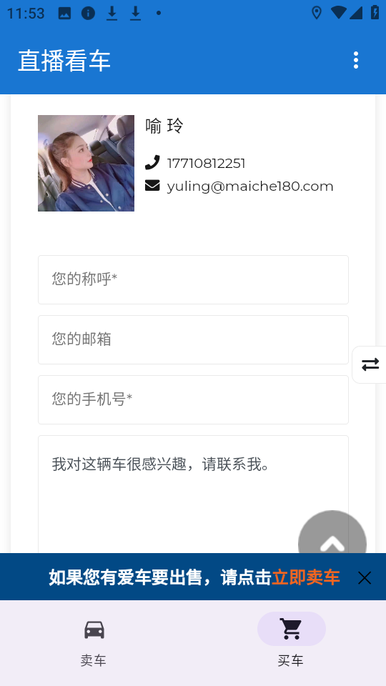4、下滑后,填寫【您的稱呼】【您的郵箱】【您的手機(jī)號(hào)】,并輸入意向說明,提交以表達(dá)對(duì)車輛的興趣。