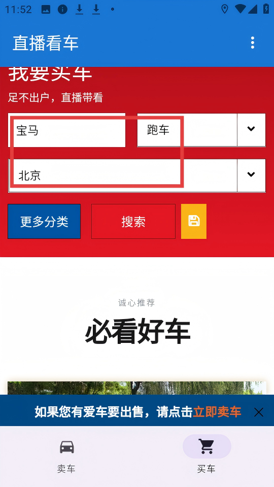 1、在【我要買車】頁(yè)面,選擇品牌、車型、地區(qū),點(diǎn)擊【搜索】按鈕查找車輛。