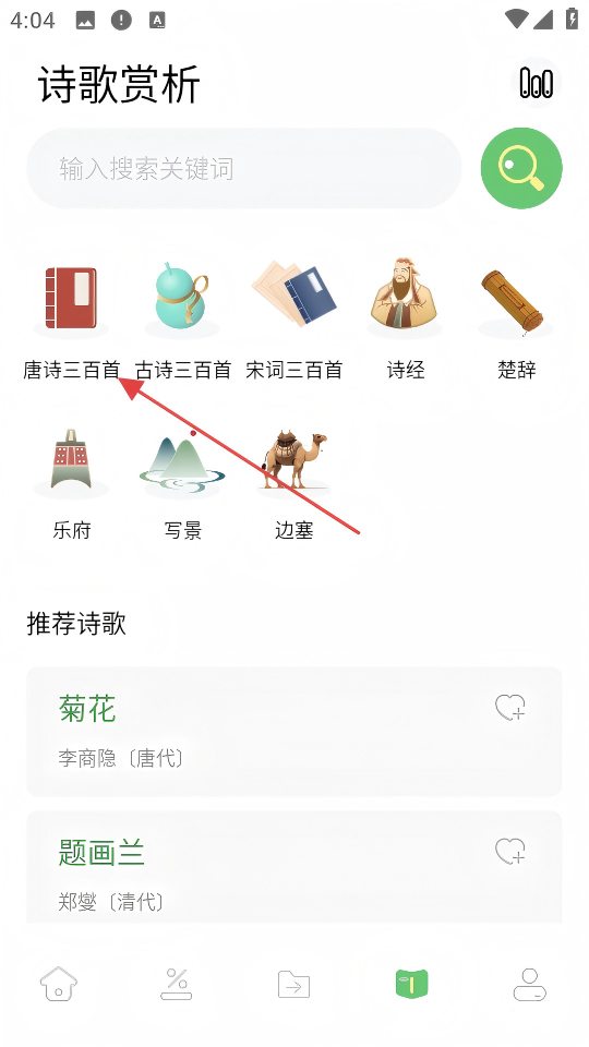 1、點(diǎn)擊頁(yè)面底部書籍圖標(biāo),進(jìn)入【詩(shī)歌賞析】頁(yè)面。