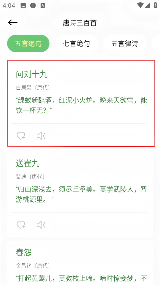 3、在【唐詩(shī)三百首】列表中,選擇白居易的《問(wèn)劉十九》。