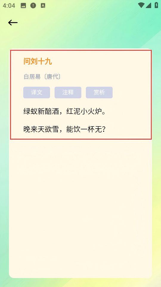 4、進(jìn)入后,可查看《問(wèn)劉十九》詩(shī)文,也能點(diǎn)擊【譯文】【注釋】【賞析】查看對(duì)應(yīng)內(nèi)容。
