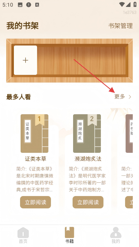 2、在“我的書(shū)架”頁(yè)面,點(diǎn)擊“最多人看”右側(cè)的【更多】,進(jìn)入古籍書(shū)庫(kù)。