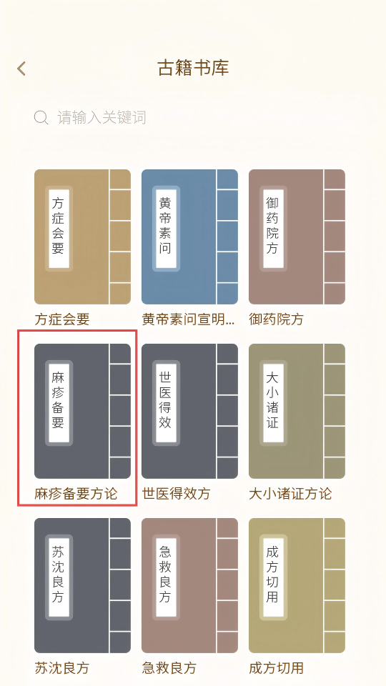 3、在古籍書(shū)庫(kù)中,選擇【麻疹備要方論】。