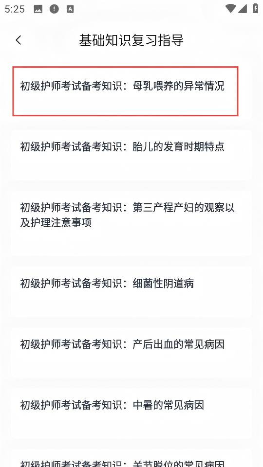 3、在復(fù)習(xí)指導(dǎo)列表里,選擇【初級護(hù)師考試備考知識:母乳喂養(yǎng)的異常情況】。