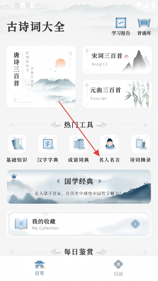 1、在“古詩詞大全”首頁,點擊【名人名言】,進入名人名言頁面。