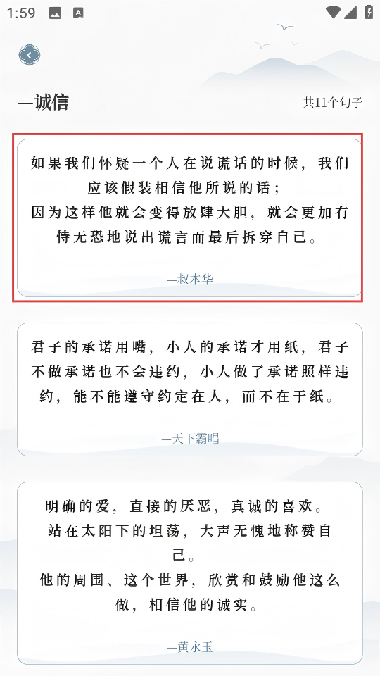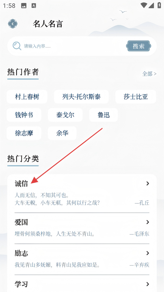 2、在名人名言頁面的“熱門分類”中,點擊【誠信】,進入“誠信”主題的名言列表。