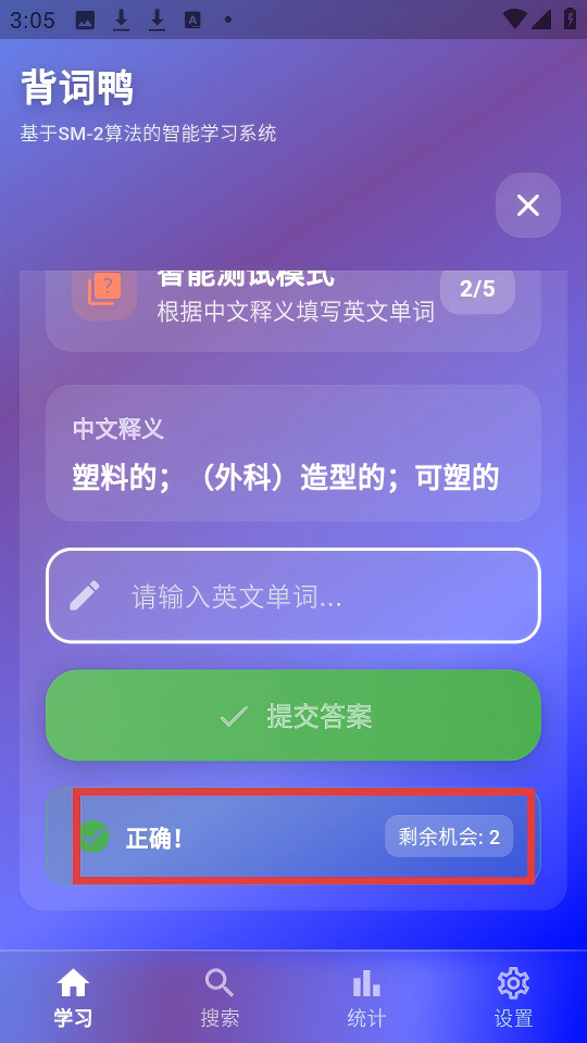4、在背詞鴨智能測(cè)試模式中,提交答案后查看正確!等反饋,了解答題結(jié)果及剩余機(jī)會(huì)。
