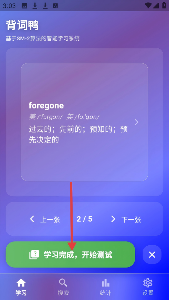 2、單詞學(xué)習(xí)完成后,點(diǎn)擊【學(xué)習(xí)完成,開(kāi)始測(cè)試】按鈕,進(jìn)入智能測(cè)試模式。