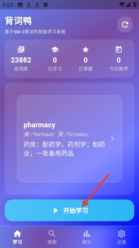 1、在背詞鴨學(xué)習(xí)頁(yè)面,點(diǎn)擊【開(kāi)始學(xué)習(xí)】按鈕,進(jìn)入單詞學(xué)習(xí)流程。