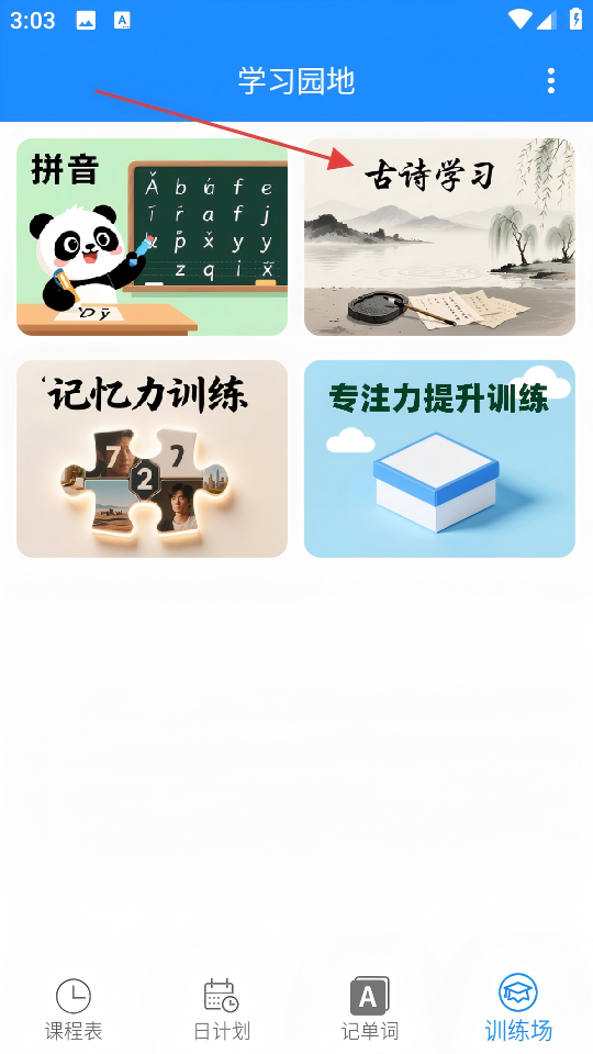 2、在學(xué)習(xí)園地頁面,點(diǎn)擊【古詩學(xué)習(xí)】,進(jìn)入詩詞鑒賞頁面。