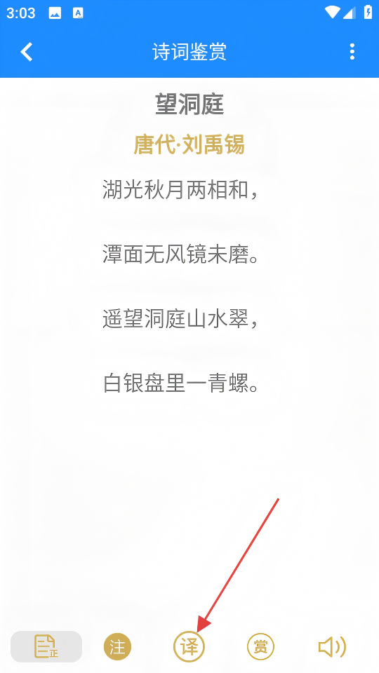 3、在詩詞鑒賞頁面,點(diǎn)擊底部【譯】按鈕,查看詩詞譯文。