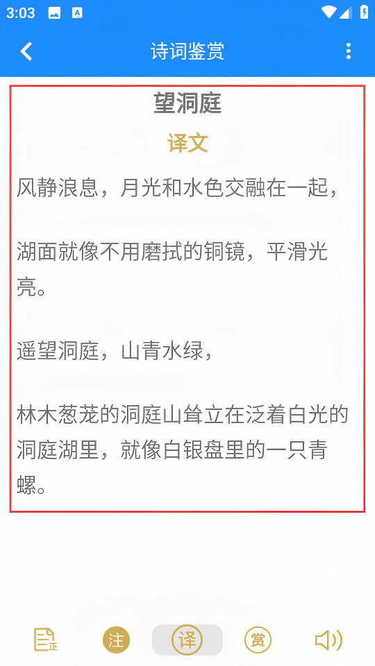 4、點(diǎn)擊后,可查看《望洞庭》的譯文內(nèi)容。