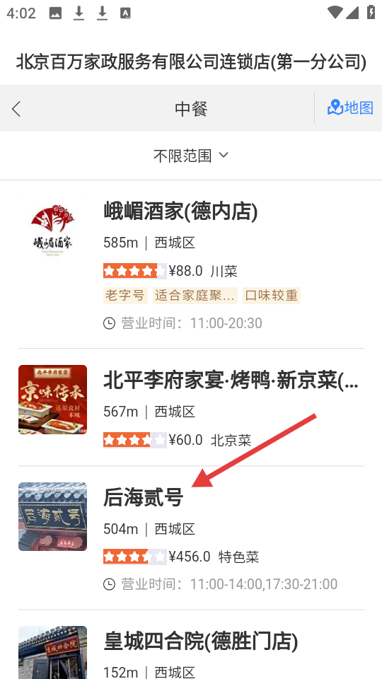 4、在中餐店鋪列表中,點擊【后海貳號】,查看該店鋪詳情。