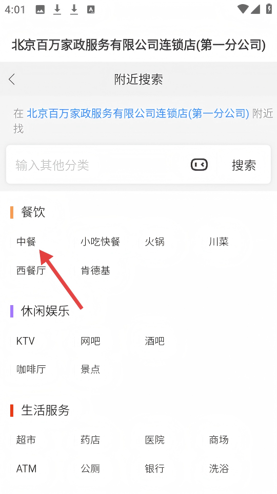 3、在附近搜索頁面,點擊【餐飲】分類下的【中餐】選項,查看附近中餐店鋪。